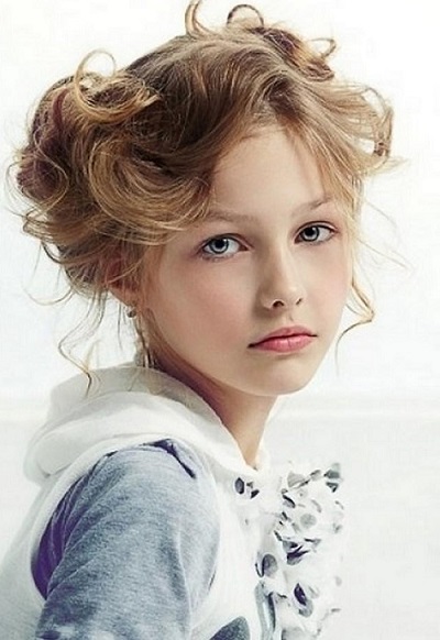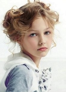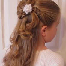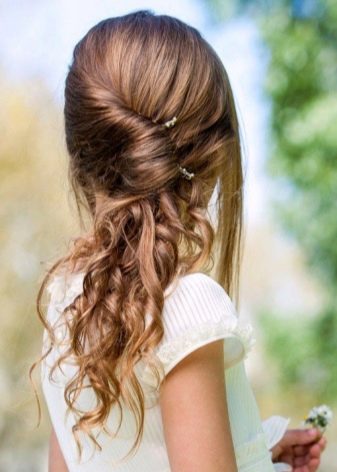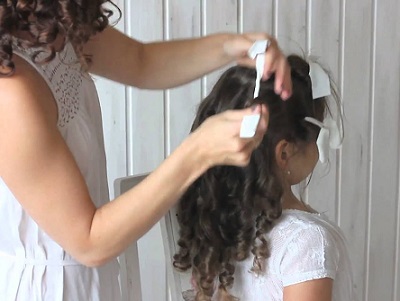Loose hair is good because it does not create any load on the scalp of the child. At the same time, managing them is not easy. If you leave them as they are, just combing them, they will interfere with the little restless person, climb into the eyes and get confused. The smaller the girl in age, the more you have to figure out how to fix the strands in front. A beautiful hairstyle with curls can be done if the front part of the hair is braided obliquely from one temple to another, fixed with an elastic band and hide the tip under the rest of the hair. The rest of the hair curd curdling, divided into equal parts.