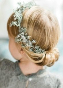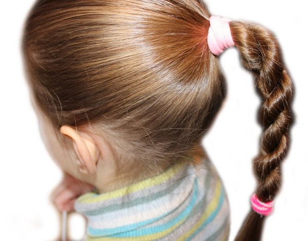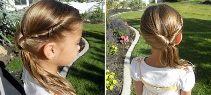 - In kindergarten or school you can make comfortable simple hairstyles using ordinary hair ties. Strands well combed, collected in the tail and fix it on the back of the head. Choose the central part of the hair and weave a braid from it. Then it is wrapped around the rest of the hair several times in length and fixed to the end of the second rubber band. This hairstyle can be modified if the oblique from the central part of the tail to wrap its base, and then fasten with pins.