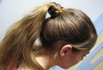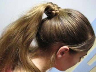 First you need to comb your hair. Highlight two strands of small thickness in the upper part. Connect them to the tail at the crown. Spread your hair over your rubber band and stretch your tail into this hole. It turns out that he was turned inside out. In the area of the temples, select two more strands and connect them with the tail. At the level of the new gum, push the hair out again and stretch the tail through it. It now remains to collect the remaining strands, tie a rubber band and again turn out the hair. Ends to comb. Is done.