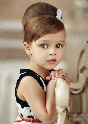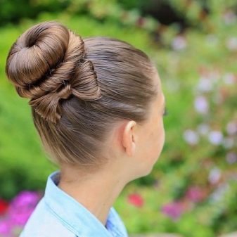- A bunch of hair can make a young fashionista elegant. To increase the size of this item hairstyle, put on the tail extra gum. Then create the desired shape. Due to the correct location of the strands on the beam, they create a pronounced pattern of hair, attracting attention to the hairstyle. Hairpins and bows diversify it and make it even more elegant.