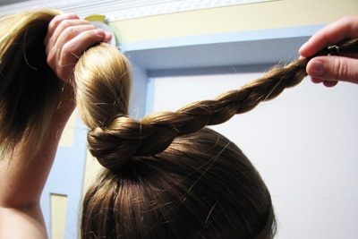 Hair should be combed and divided into two “blocks” horizontally so that the upper one is slightly smaller in volume than the lower one. To twist the top part in a plait and, turning counter-clockwise, to make a bunch at a desirable height. Stabbed with studs. From the remaining strands, also create a bundle and wrap it around the bundle. Hide the tip of the hair and fix the "composition" invisible.