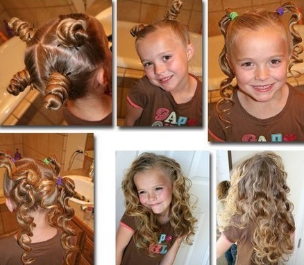 A safe and proven by many generations of young fashionistas tool for “curly hairstyles” is the use of rags. From the fabric to make strips of a centimeter width 2 and a length - 10. In the middle to wind white paper. On these pieces of paper you can wrap the strands moistened with water and fix them by tying rags with a bow. The thicker the strand, the larger the curl and the longer it will dry. Having rolled all the hair, the child’s head needs to be tied with a kerchief. Papilotki remove after complete drying, split curls with your fingers. It remains to fix, for example, the top strands with a rubber band at the top of the head, and the festive hairstyle is ready.