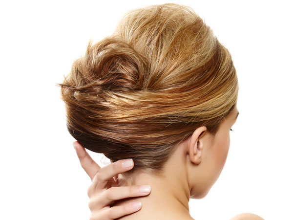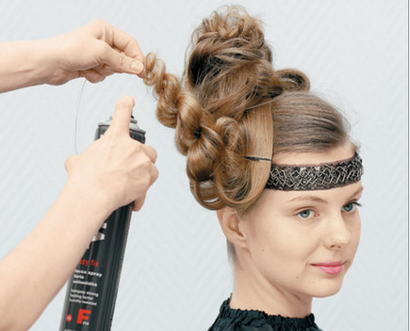 First, all the hair combed back.The strand on the top is separated from the rest. It is scratched and sprayed with a lacquer for fixation. It is sprayed from the inside.