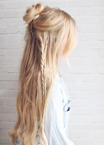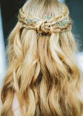 With a strong volume, it is better to remove the upper part into tails, braids, or use other methods of weaving, since this is the only way to create the same version with semi-flowing hair, in which curls will not crawl into the eyes.