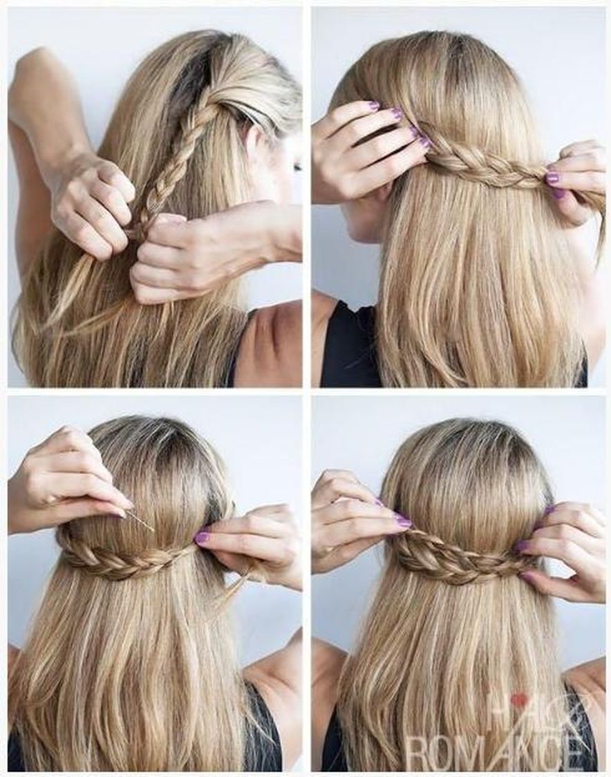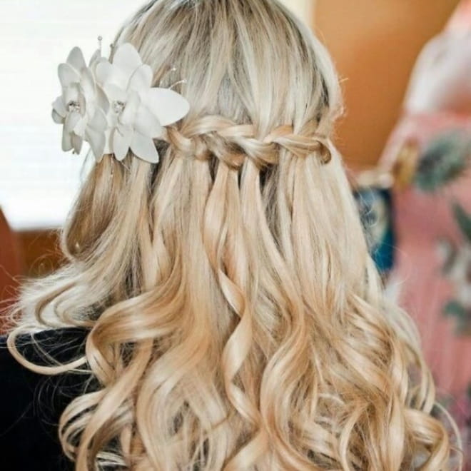 Long curls - it is always a lot of options for how you can wear them every day. One of the most popular options is the creation of a flower on the head.This hairstyle is done on the principle of "Malvina". First, the hair is divided into two parts, the first one, which is on top, is pulled into a high tail. It is also divided into two parts, and each twisted, then intertwined with each other, it turns out something similar to the rope. The resulting harness must be wrapped around the gum and secure invisible.
