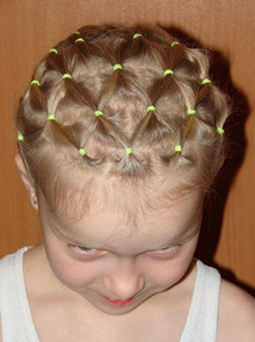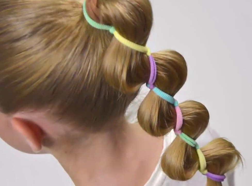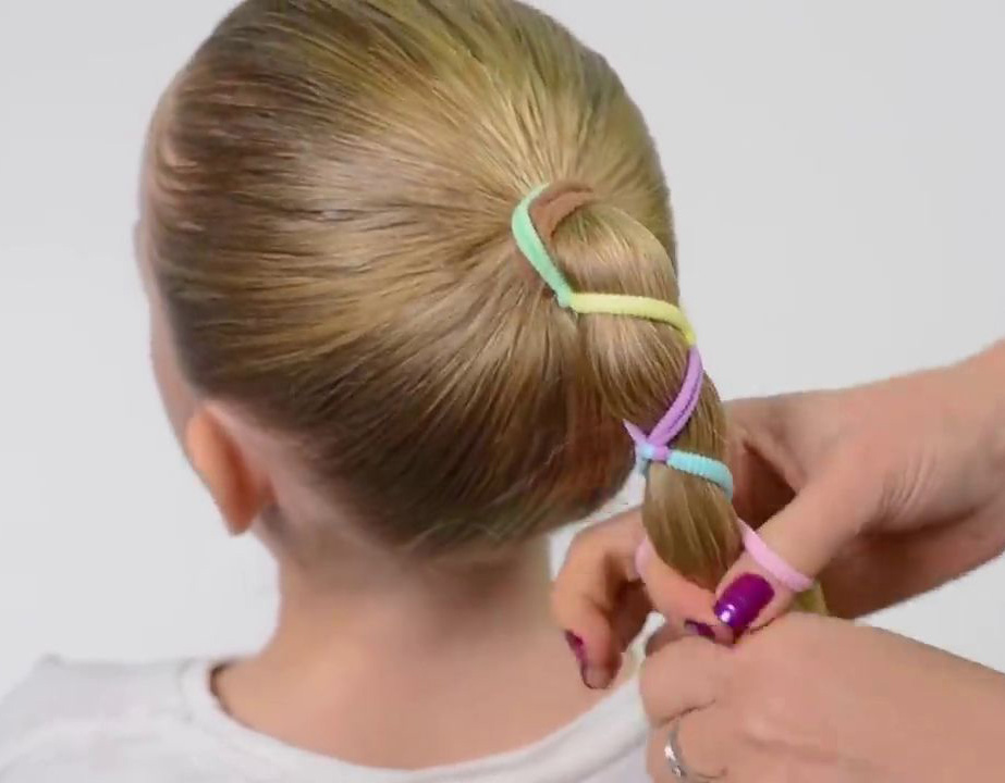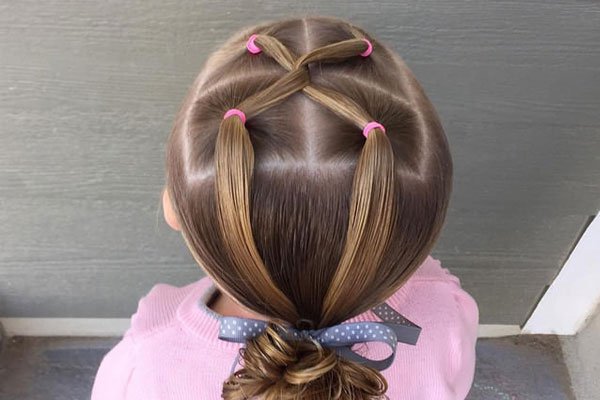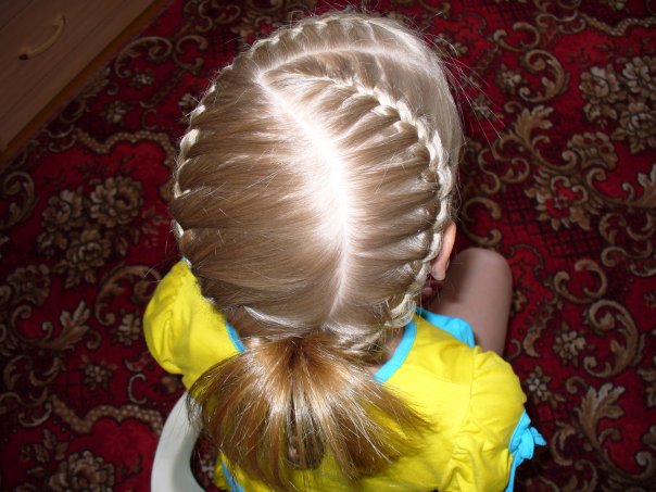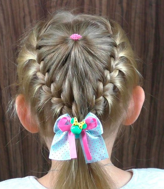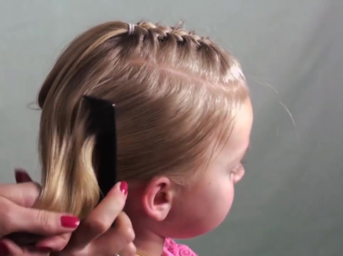 Comb your hair. We divide them into 3 parts to the middle of the head and fix. The first part is divided in two and we tie tails. Then we divide these 2 tails in half, and by the same principle we tie 4 tails. We are working on all this and with the third part of the hair, there should be 6 tails. In the end, we tie a bundle (if desired, the same “operation” can be worked out with a tail). Our simple hairstyle is ready, and the child is happy and beautiful in the garden!