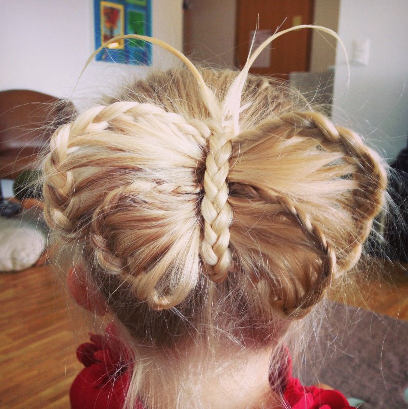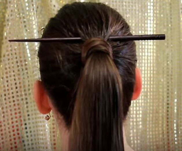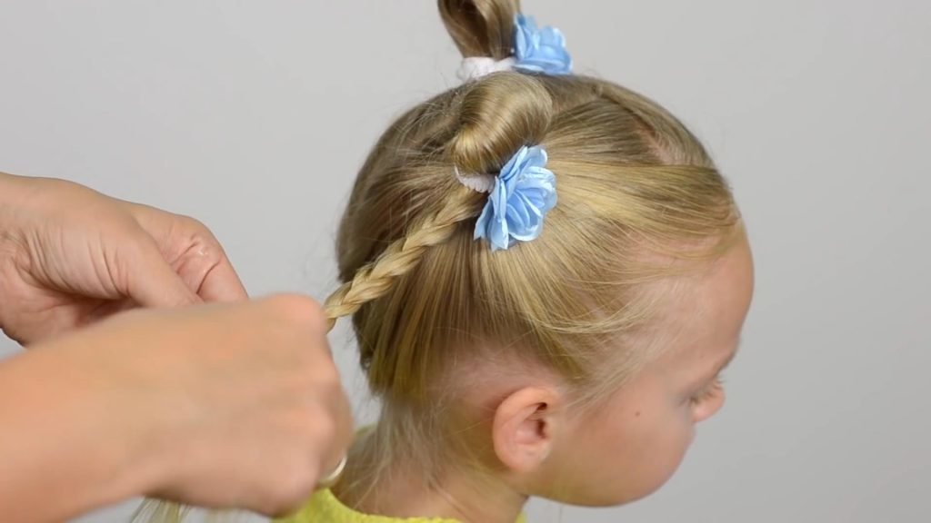 Comb your hair. Tie a high bundle. Now insert the stick (pencil) under the eraser. Divide the bundle in half and hook the two strands on top of the wand. Fix the bottom. Again, we divide the tail in half and do the same. What remains, we braid and fix. Now you can add decorations and take out the wand. Our butterfly is ready to sit forever on your little flower, flapping its wings!