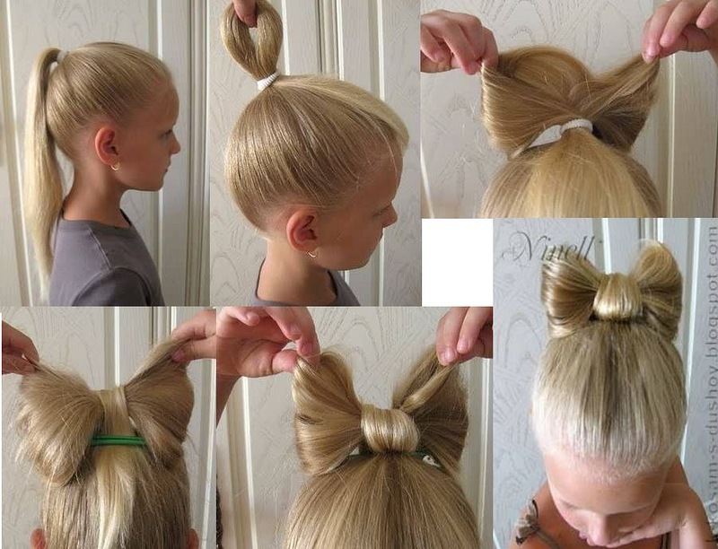 Comb your hair. Big rubber band tying high bundle. We take the top two strands and indented 5-8 centimeters fix rubber band. Now we pin the fixing points with the studs to the bundle. Our bow is ready. We take from the tail two strands of average thickness and weave pigtails (these will be the tails of our bow), fix them with rubber bands. In conclusion, you can attach a beautiful hairpin on the bow. Cute and elegant hair is ready.Everyone is happy with the result.
