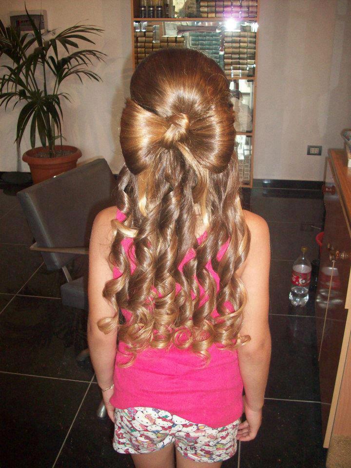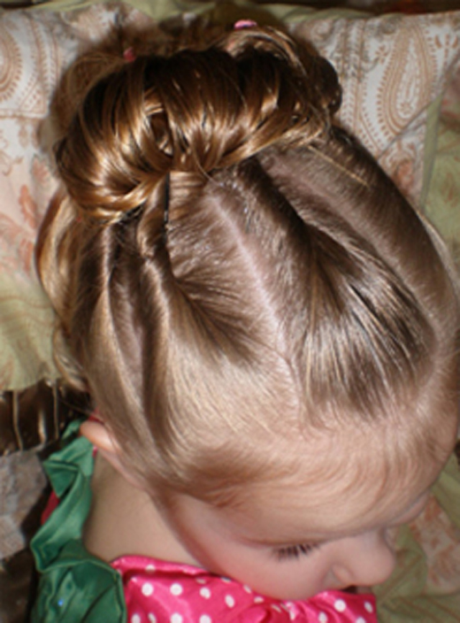 Comb your hair. Parting in the middle and on the sides. We take one strand (the rest can be fixed for a while, so as not to interfere) and tightly wrap it in the middle. Fix the resulting curl. Now let's do the same with the rest of the strands. Next tying bundle. The child is assembled, but in time this hairstyle took not so much.