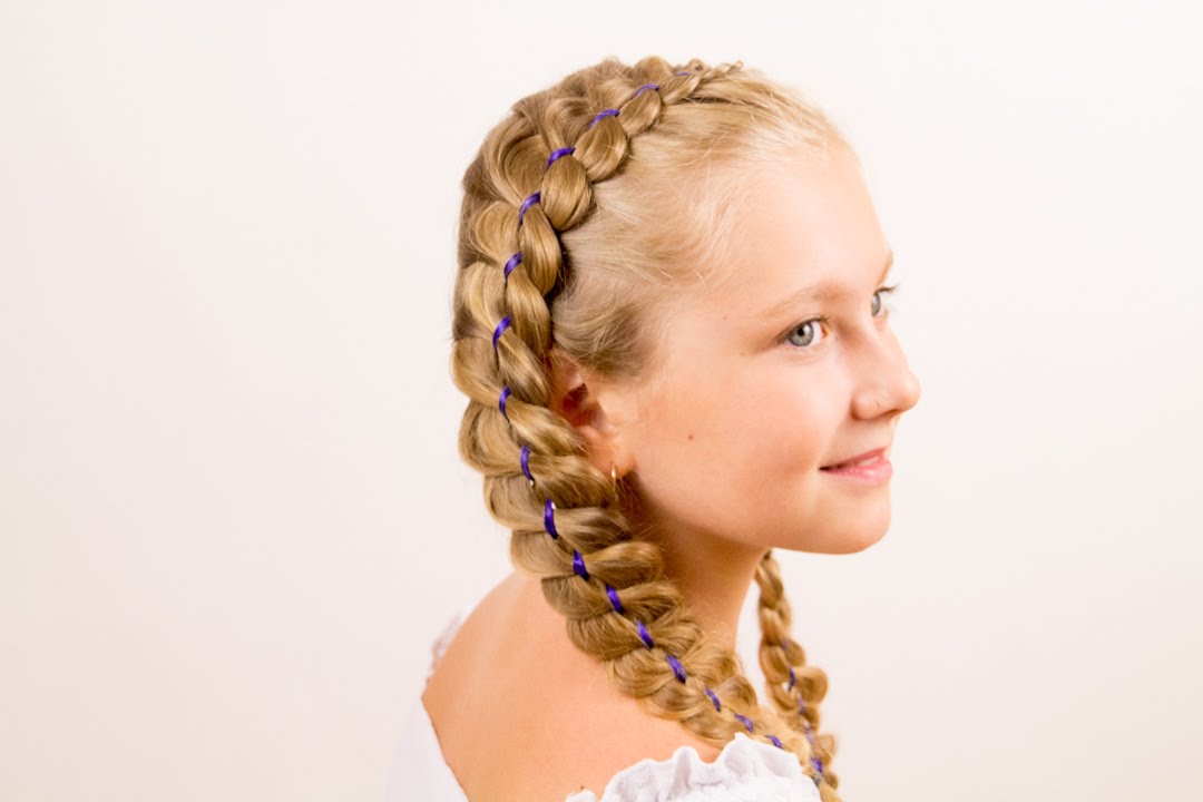 - The remaining hair is braided into any braid, you can decorate your hair with hairpins or use a ribbon.