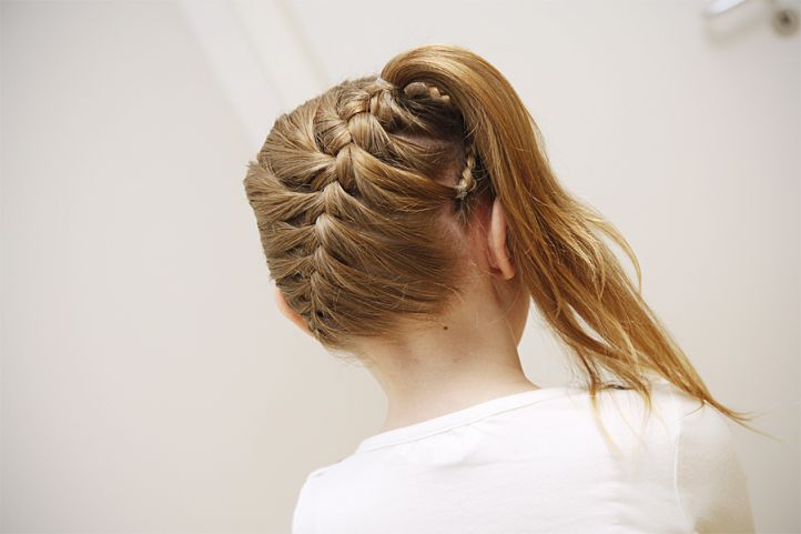 Another equally popular option is the tails. There are many different variations of them: low, high, you can also add braids and ribbons to them. Any of these options looks good and allows you to remove your hair as much as possible so that they do not interfere with play. You can braid a high tail, and then weave a volume braid out of it.