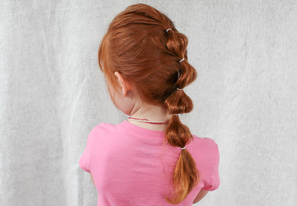 - All hair is divided into 4 parts and three are tied with rubber bands. Most importantly, the parting has a triangular shape that starts from the top of the head and extends to the forehead.
