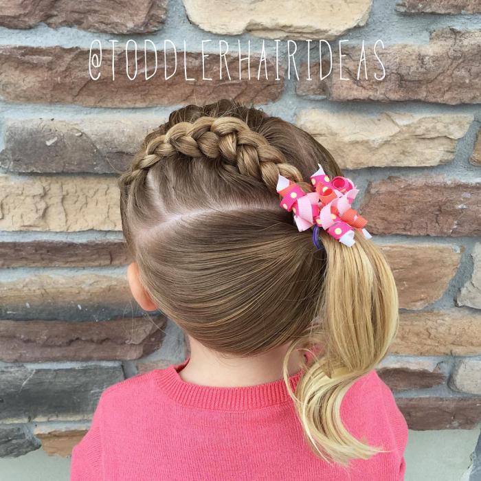 If tails or pigtails individually look very boring, you can try to use them together to create a more attractive hairstyle. The classic combination for a little girl is a single-line French braid and horse tail. It will be necessary first to braid the braid from the line of the forehead to the occiput, but it does not finish to the end, in the middle a ribbon is woven into it, with which the tail is tied at the end.
