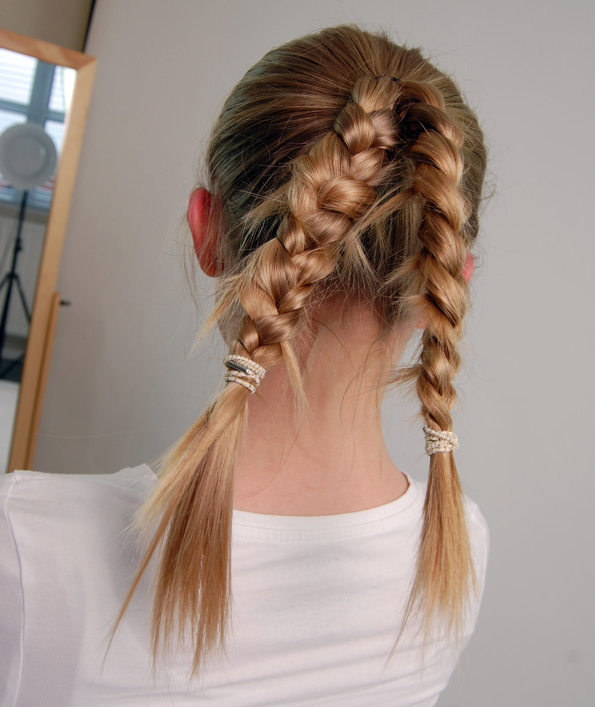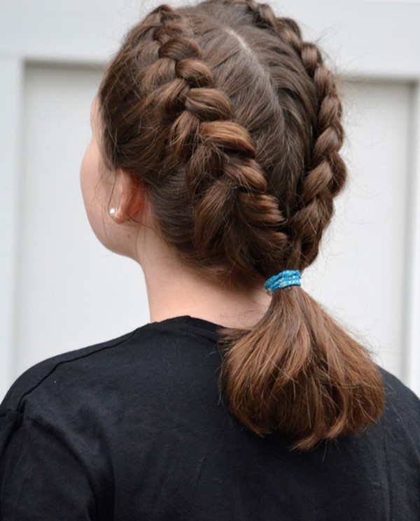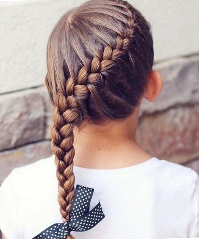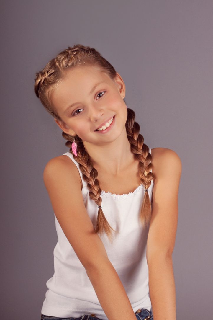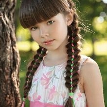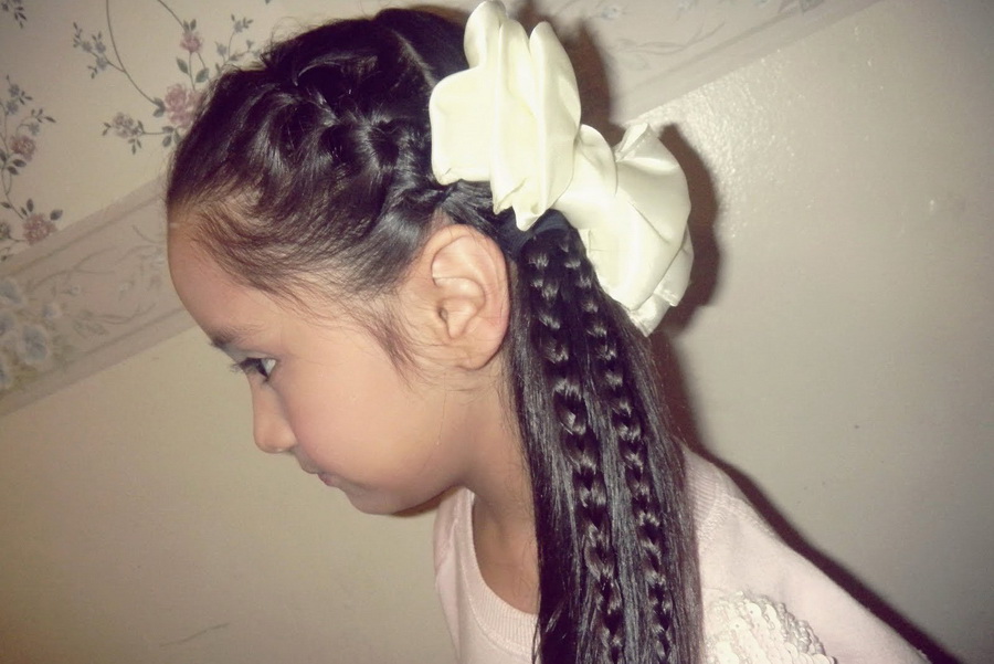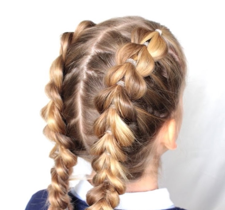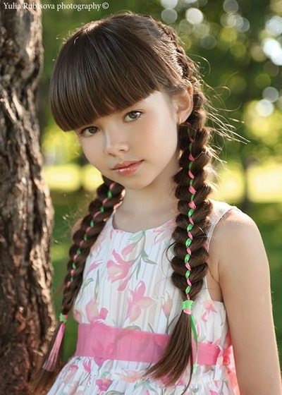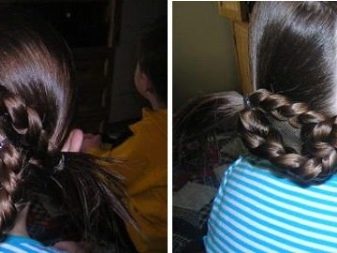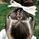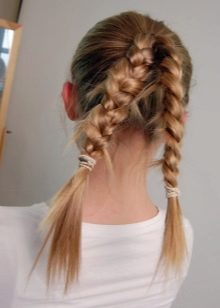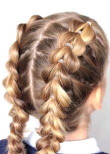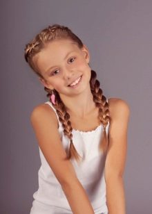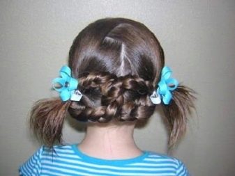 Simple two braids can be varied by weaving. For thick and long hair, you should arm yourself with the skills of German surround creation of two braids on each side. This hair styling will be universal, so it is suitable for younger, middle and high school. Bows can act as a decoration, you can also weave ribbons into braids.