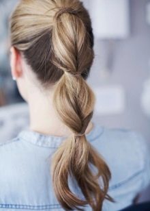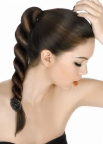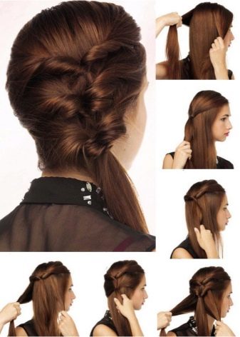 Another idea for a hairstyle from one long tail can be styling from a tail twisted through the middle, from which a regular or inverted braid is then assembled. And she, in turn, is twisted into a roller and secured with pins or a mesh at the base. To decorate a hairdress it will turn out any hairpin, corresponding to school, or a tape.