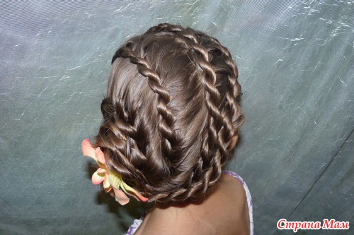 For primary and secondary schools, daily hair can be considered option to create eight of long hair. Implementing an idea is very simple, for this weaving tails, the ends of which are collected in braids. Next, the pigtails are assembled into a knot at the back of the head, and the ends are fixed at the bases of opposite tails. You can use a tape in the middle of the weave, which will make it easier to fix the tips of the braids.