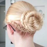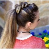 - Gathering hair in high beam, you need to pull two or three small strands from its base. From them weave net braids. Then, the resulting braids are stacked on the base of the beam for each other. Braids are fixed on stealth, while their tips are hidden under the base of the beam.