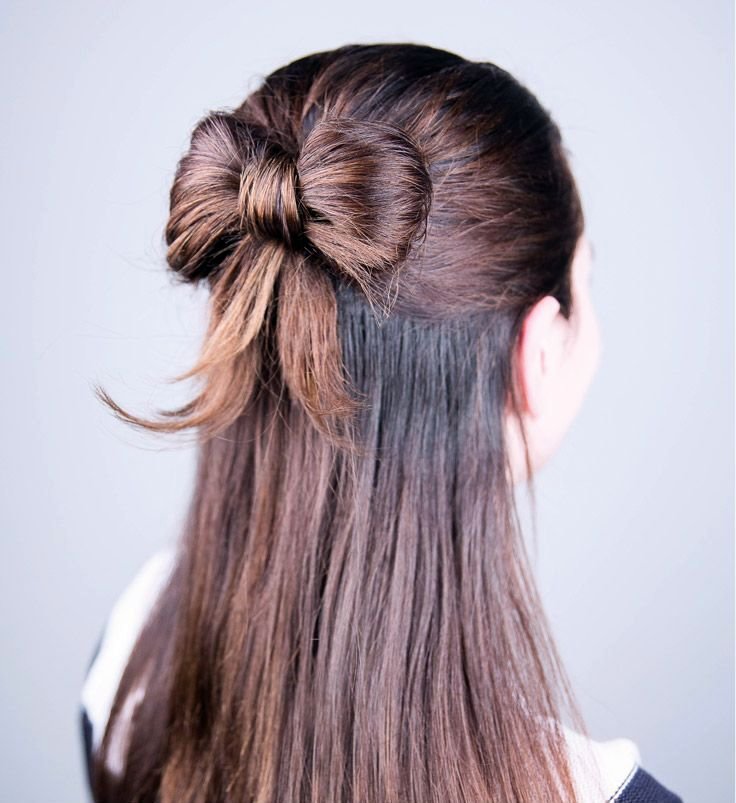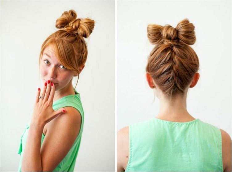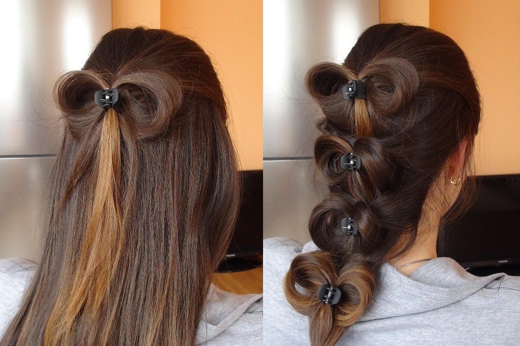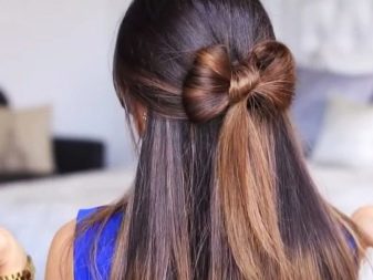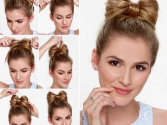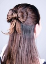 - Neat bow can be obtained in just 2 minutes. For this you will need to collect hair in a ponytail. But on the last turn of the eraser to stretch the curls not to the end. Thus, the curls will be divided into two identical parts. They are moved apart on the sides and fixed on stealth. The tip, which remained from the tail, will close the middle of the bow. To do this, he tucks and fastens.