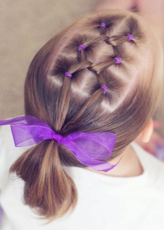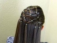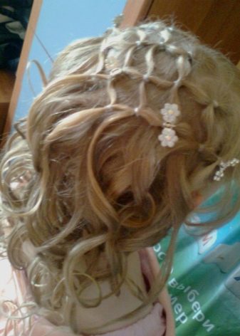 Rhombic is the original version for loose curls. Ideal for elementary schoolgirls. For a start, several small tails are made from direct parting on the sides. Then each tail is divided into two parts, and each of them is connected with a strand from the other tail. It turns out a kind of "waterfall". With this styling, you can remove hair from the front of the face, which, as a rule, interfere with writing and reading.
