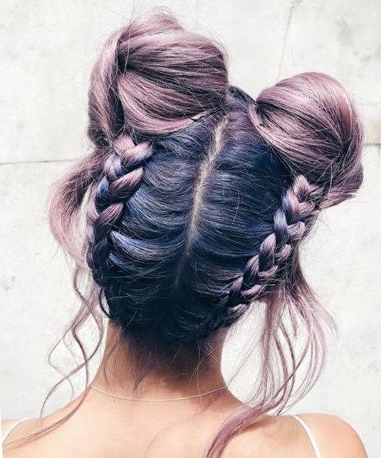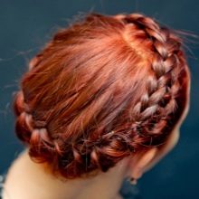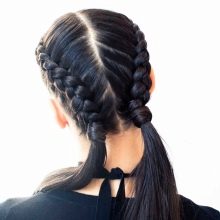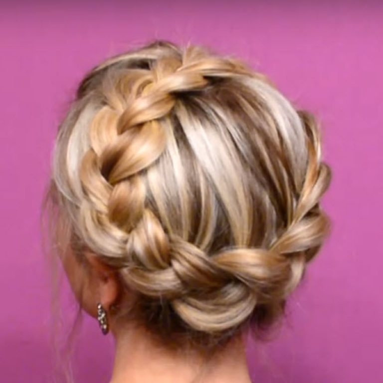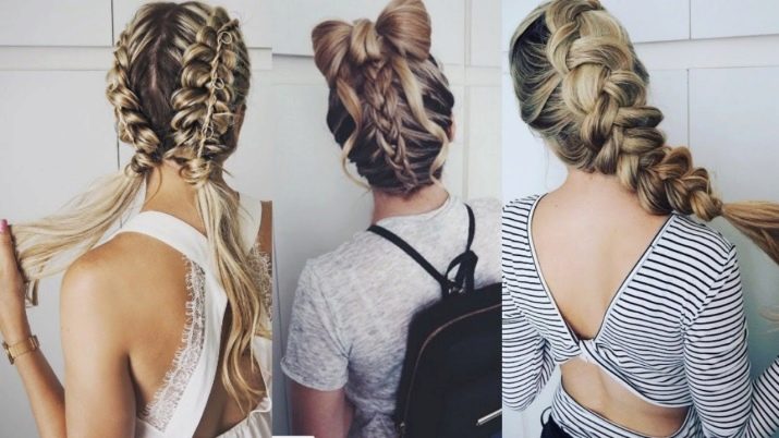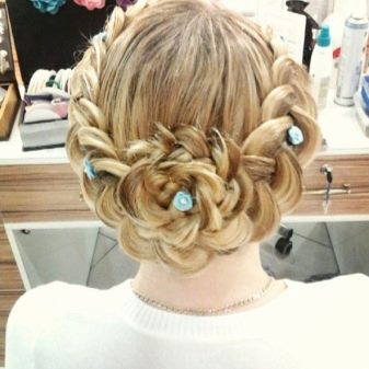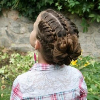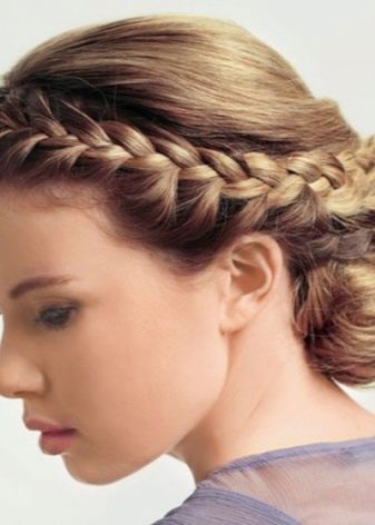 - By making two low braids on both sides, one of them must be stretched around the head above the forehead. The second stretches along, but through the back of the head. You can fix on the studs and invisible.