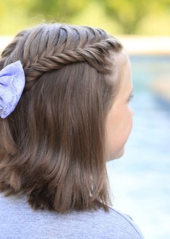 Schoolgirls of elementary grades may like loose curls on a square with a zigzag parting. Neat tails on the sides and decorated with white bows will help to open your face and cope with naughty curls. If the length allows, you can braid a French (or reverse) braid from the forehead to the temporal region. Straight short curls will look especially impressive in the side “spikelet”. It differs from the classical one in that the strands are not woven into the pigtail, but remain uncool.