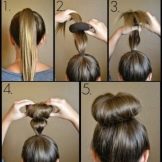 To create a neat everyday beam will take very little time, it may consist of braids, braids or regular straight hair. In order for the hairstyle to last as long as possible, the main thing is to collect hair at the base securely and tightly. A bundle can be made on the back of the head or on the top of the head itself, and it is worthwhile to additionally fix the hair with the help of hairpins or stealth, their number will depend on the density of curls.
