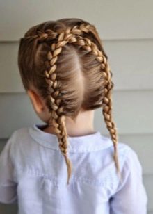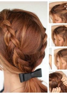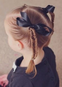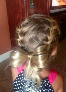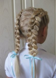 To make something beautiful and unusual, for the lower grades it is possible to combine two variants of everyday hairstyle at once. This applies to the usual high tail, supplemented by the French oblique on the contrary along the entire length or by weaving a “fish tail”. For elementary school, you can make two symmetrical tails, interconnected in a braid with some kind of decoration in the form of a bow or barrette.