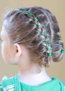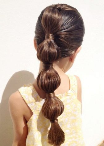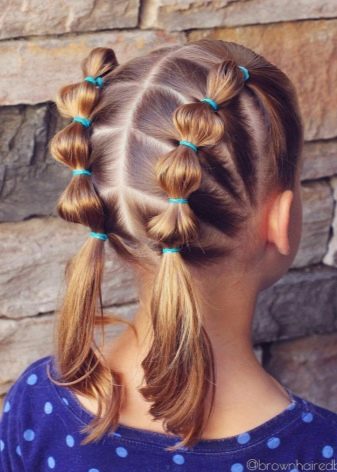 Tails will always be relevant for schoolgirls, you can diversify the everyday image with beautiful symmetrical tails with “flashlights”, which are easily made with the help of several bright elastic bands, fixed along the length of the hair.