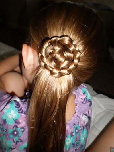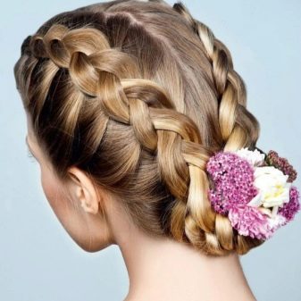 Among the beautiful and festive ideas can also be identified the usual high tail with a flower from the hair. It is very simple to make it from a braid that is laid on top near the base and stabbed with a pin in the shape of a bud. Curls in the tail can be left straight or curled with a curling iron.
