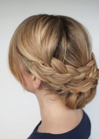 A very simple and current technique of creating a school image, this option is preferable for elementary school and middle classes. To weave a basket on the head, it will be enough to make two ordinary or French braids on both sides, and then connect their ends with the opposite base behind or in the form of a rim all over the head. In this case, you should focus on the length of the hair. As a rule, the average length will be enough to fix the braids in the back. The ends can be fixed stealth or use tapes woven into the braids for fixing at the base.