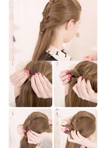 The main function, in addition to the beautiful image, of school hair is convenience. In order to make a comfortable hairstyle that lasts all day and will become an ornament for schoolgirls, especially younger ones, you can use several twisted tails that are simply threaded inside when assembled. This arrangement, consisting of only three or five tiers, will be a very interesting, and most importantly, practical option.