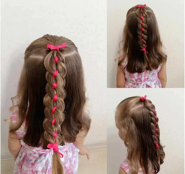 Also, the usual two braids can be braided together with a ribbon, which can go along one spit or interlace with the second.