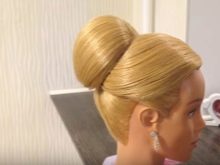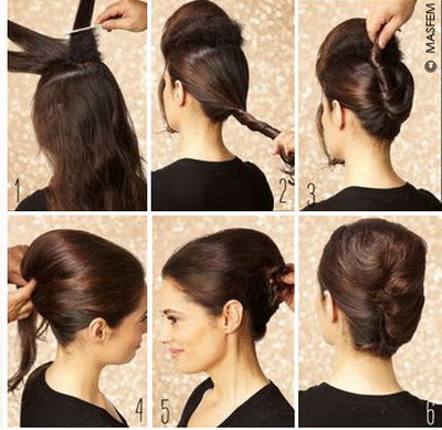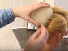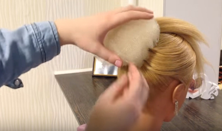 We make a very high tail. Then throw it back. With a roller we pin the base of the tail. Next, fasten the roller with a rubber band, and hide it under the hair. Curls that remain, bend under the roller and fasten with a barrette. The creation is ready, we only fix it with varnish.