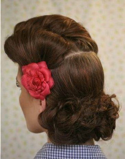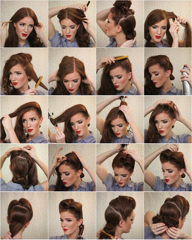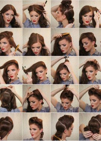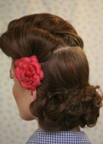 These are hairstyles with hair twisted on large curlers. The accessory was a bezel of colorful fabrics. The most elegant look is the 50s and 60s. To replace the short hair came combed lush hair.