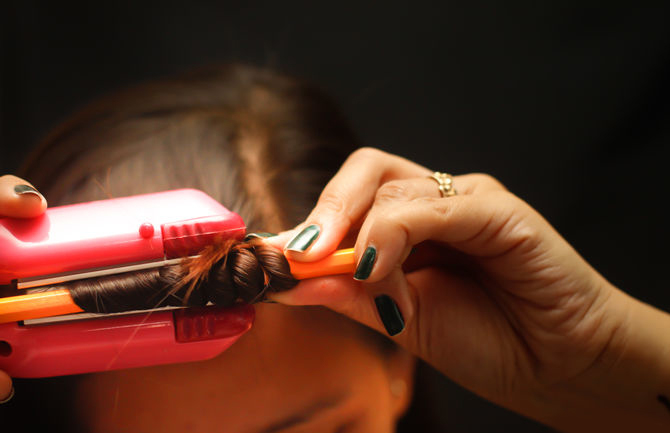 - prepare the hair - wash and dry slightly, treat with thermal protection agent;