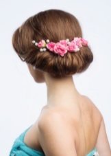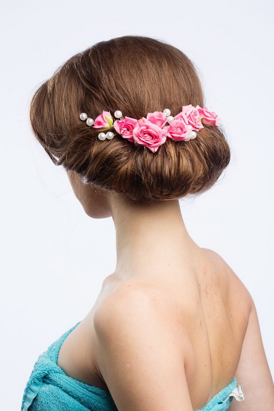 Important! If you decide to dilute the hairstyle with a flower, remember the following: for fine hair, use one small artificial flower, for thick hair - a few small bottles.