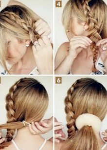 - starting from the temples, braid the two braids on the sides, leading them to the back of the head; secure the entire result with a rubber band;