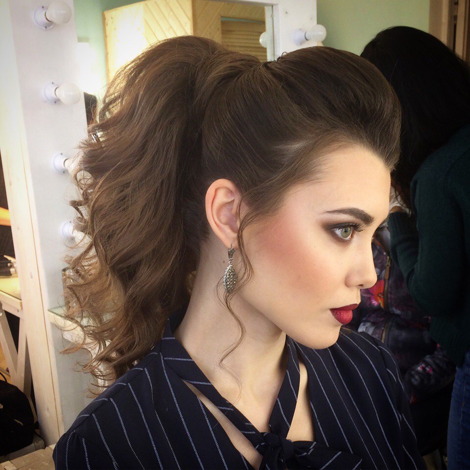 The pomp on the crown and temples is not only the decoration of a regular tail on the back of the head, but also an original trick that helps young ladies to appear taller. To correctly use it, the tail with a raised top should be done according to the following strategy: