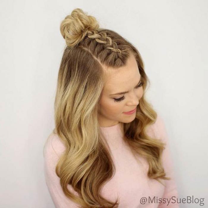 This is the simplest weaving that will be looked neatly, even if you do not have much experience. The main thing is to fix braids well with invisible ones on the sides. Hair should be of sufficient length.