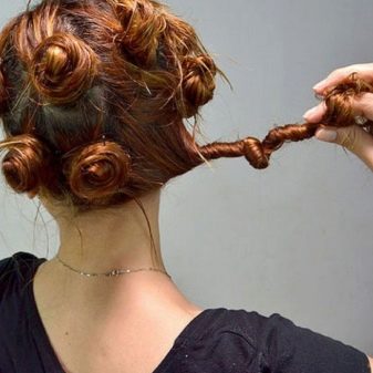There is absolutely nothing at hand - there is a way out. We take a strong thread. Her cut, folded in half, slightly longer than the hair. Tie the middle of the thread at the base of the future curl and twist it into a bundle. Gradually, along the length of the curl, a spiral forms, which is collected in a bun on the head. Fix, twisting the ends of the thread. Such gulki make all over the head.