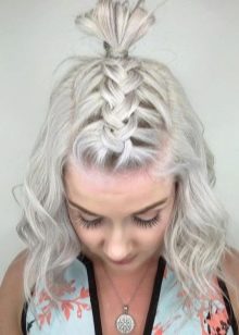 - Hanging strands must be collected in a loose tail. But do not fix the rubber band, and make light braids in such a way that they are not overtightened and visually seem free.