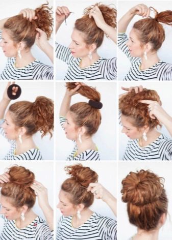- Curls must be treated with mousse, dry and twist to create volume. After that it is necessary to divide the hair into three parts. Two strands on the sides and one at the back, and a bundle is made from it.