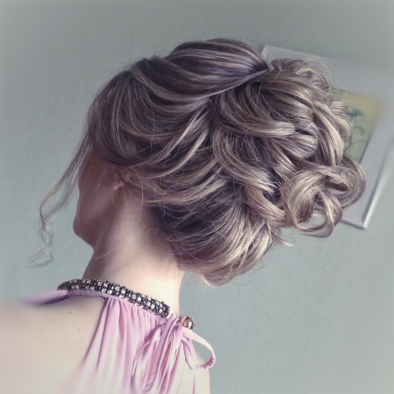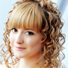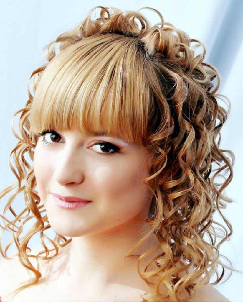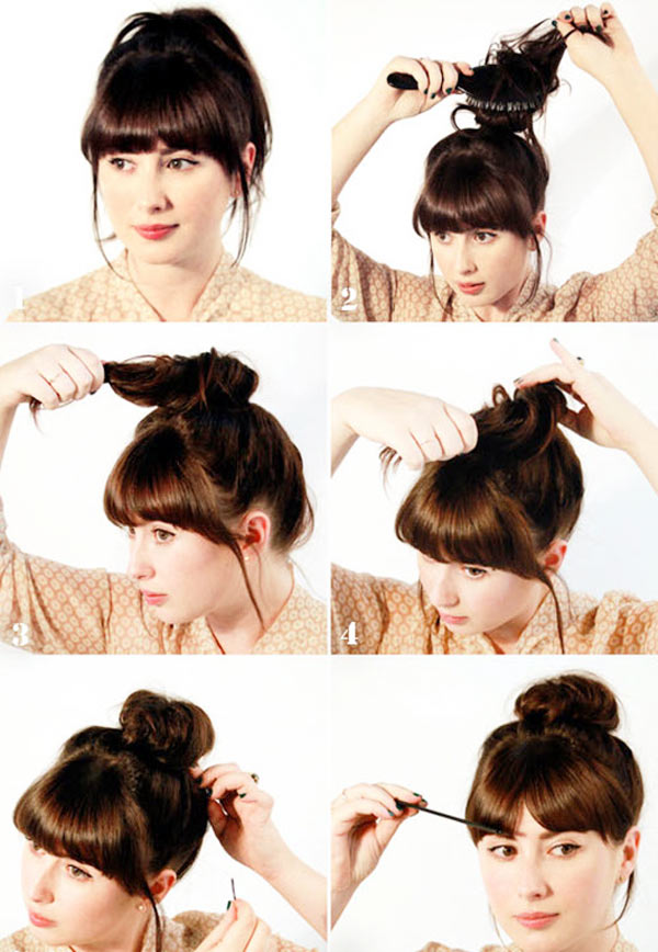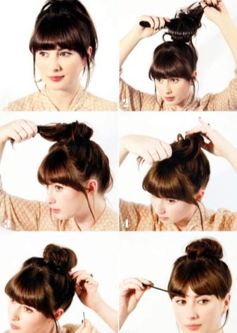 - Curls should be well combed, select the bang, and the main part to collect in the tail and secure with a rubber band. Lay in a circle and secure with pins. Bang comb and give it the desired look.
