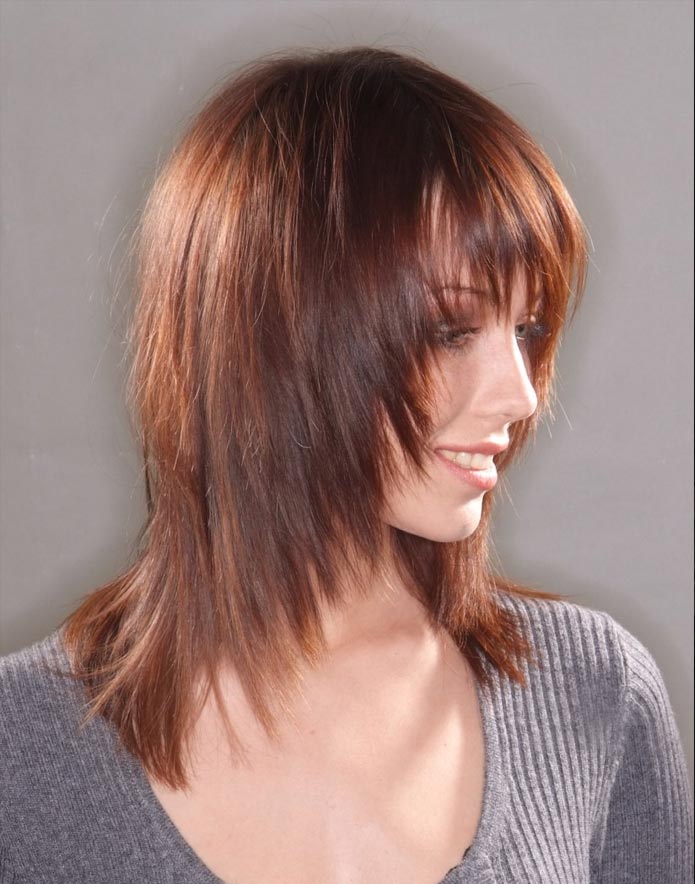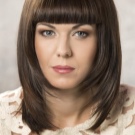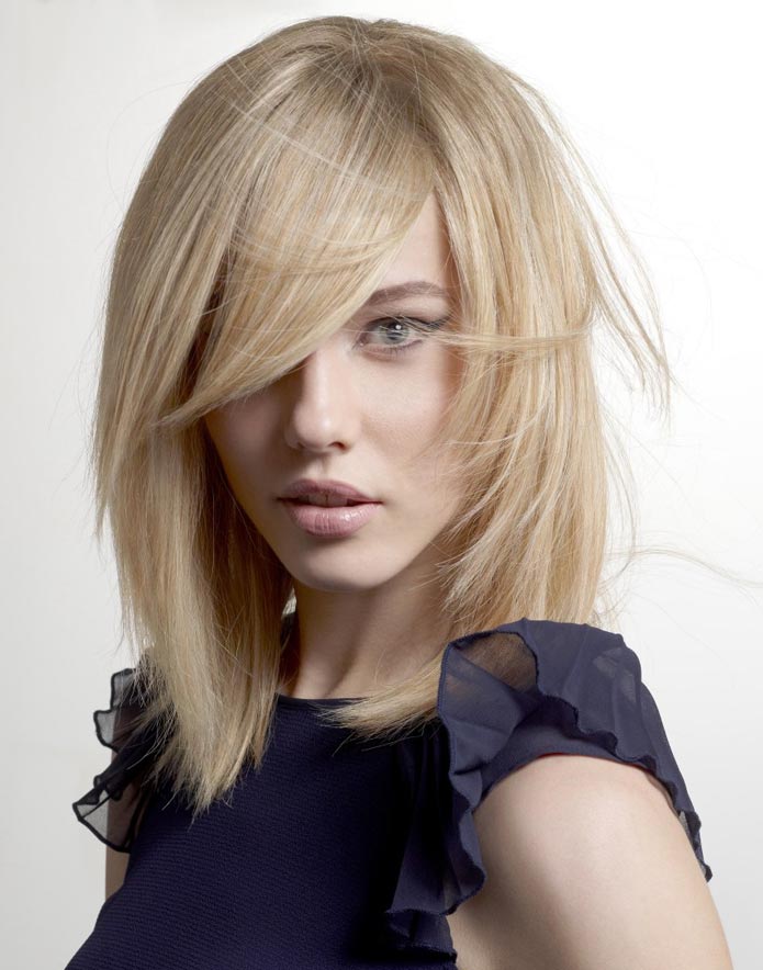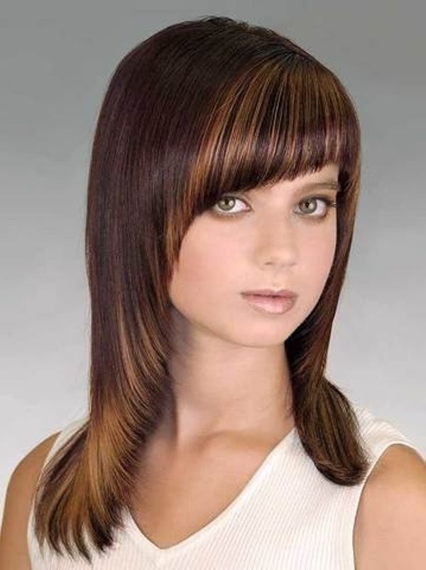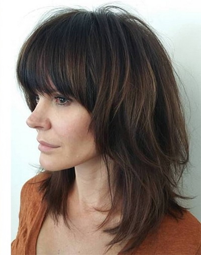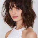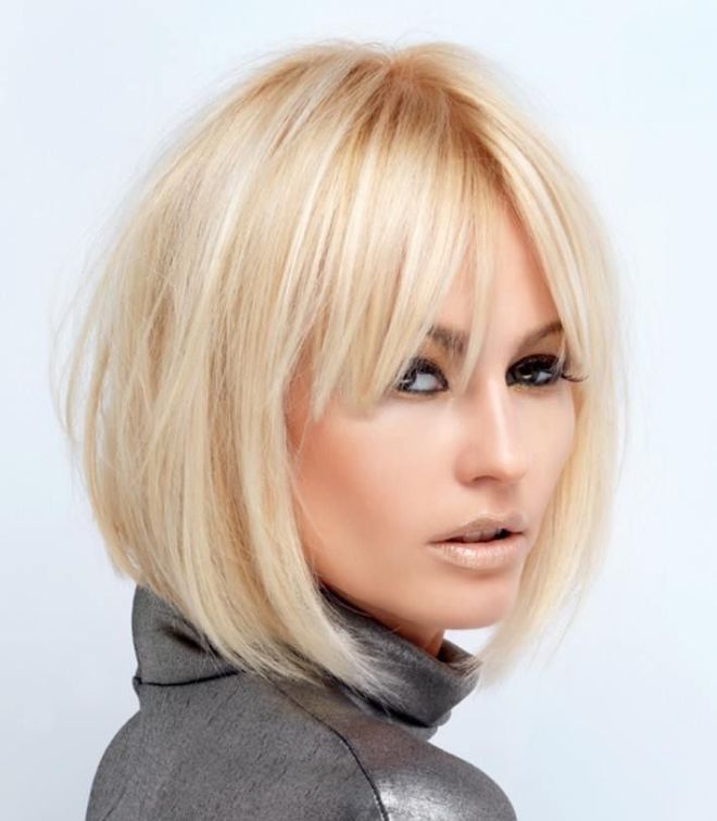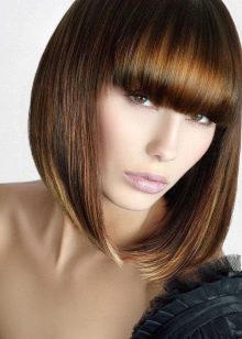 Straight bangs are most often performed with haircuts at an average length of bob and square. Oblique is a harmonious extension of the length of the hair to the shoulders, compensating for the irregularity of the features and is suitable for women with a square or round face shape. This element of the haircut makes sense to complement the hair with wavy strands. It emphasizes the density of the hair, combined with haircuts such as cascade or bob.