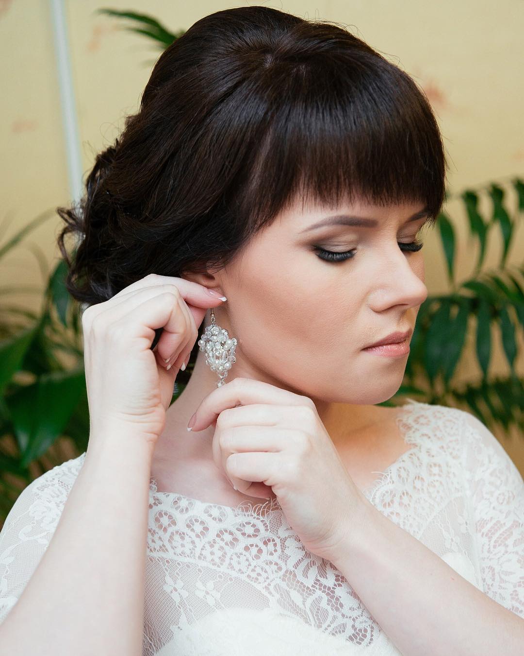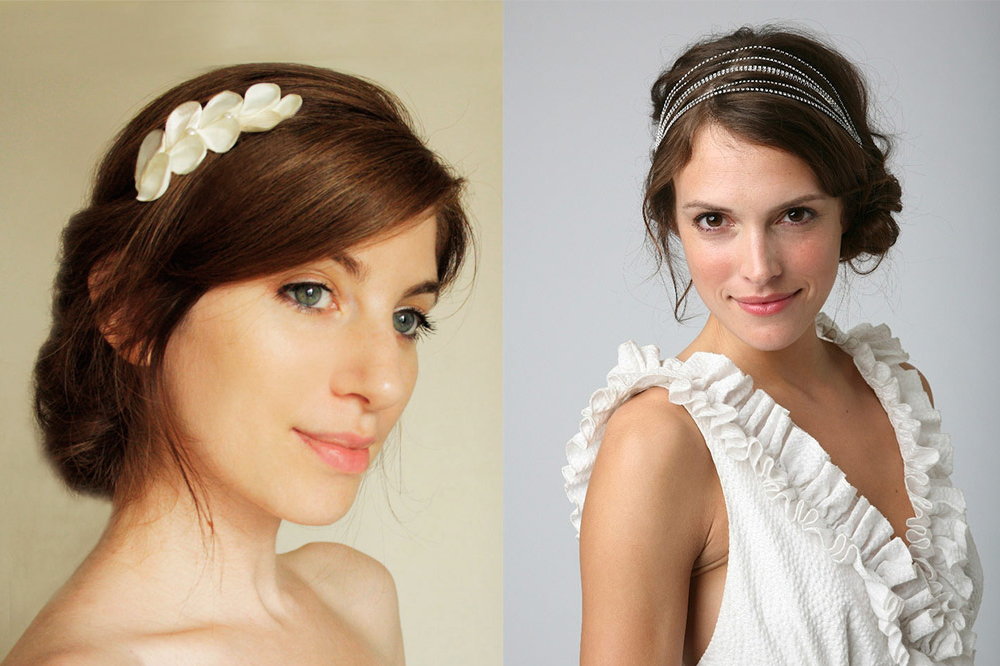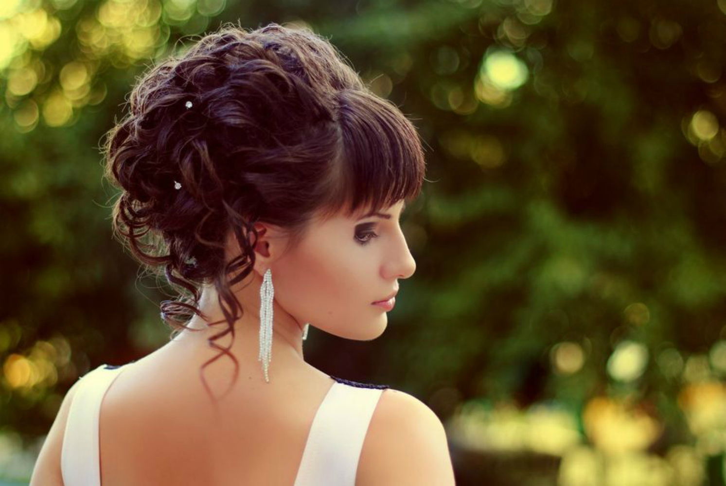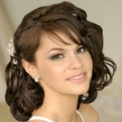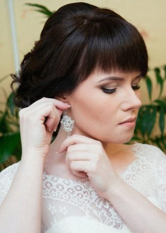 - Bangs to lay. Short strands at the temples to release and slightly twist. Hair can be decorated with flowers or beautiful hairpins.