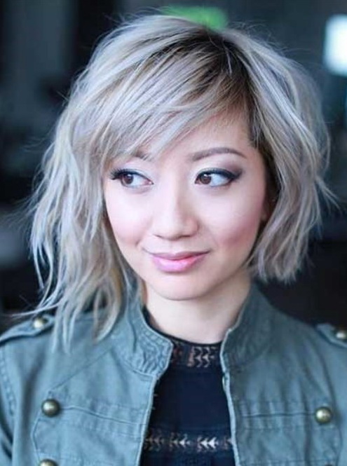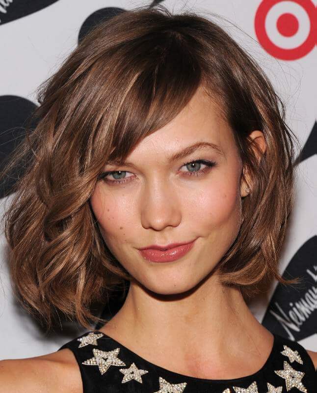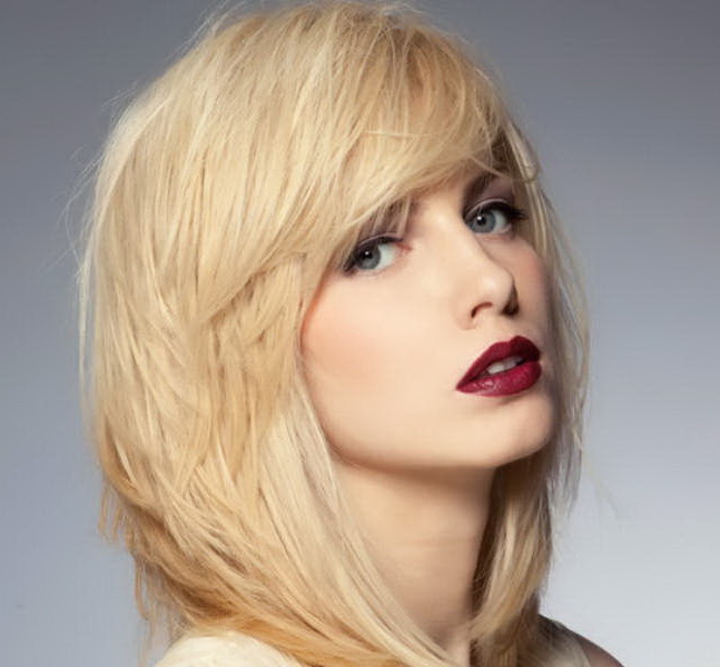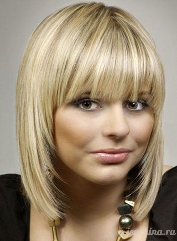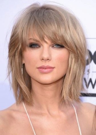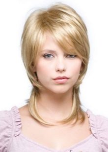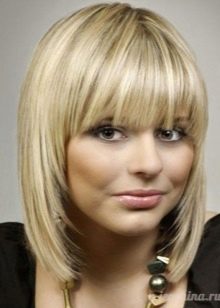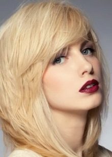 The elongated bangs, which are worn to the side or dividing in two on both sides of the face, hides the asymmetry, visually makes the shape longer and already, focuses attention on the lips. At the same time, it requires constant adjustment and application of styling products. It goes well with a haircut type cascade, square or bob.