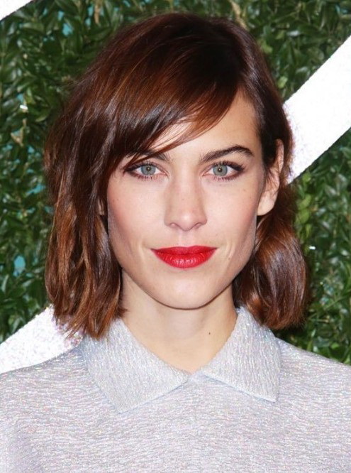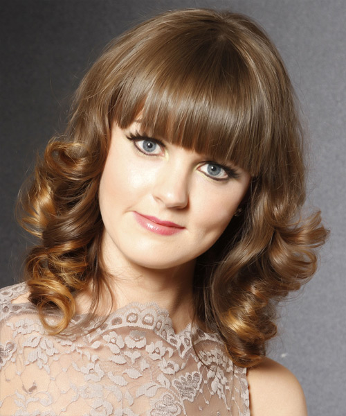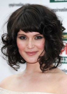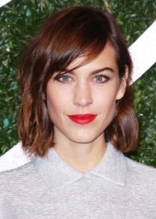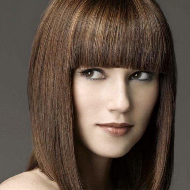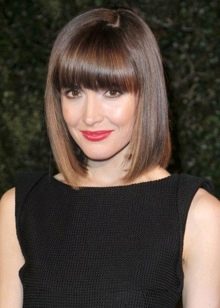 This bangs well with wavy strands, gives the face the correctness, allows you to focus on the lips. At the same time, it requires systematic styling and adjustment in order to maintain a smooth cut line.