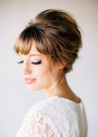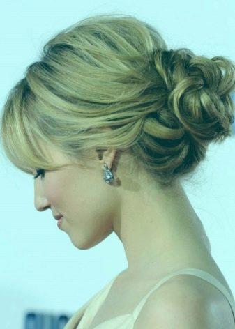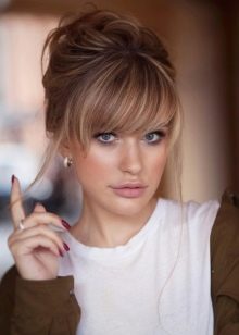 - Bangs give the desired look. Tighten the hair from the beam to give volume closer to the face. At will, stretch the strands on the temples. Now even thin hair gives its owner a delicate and elegant look.
