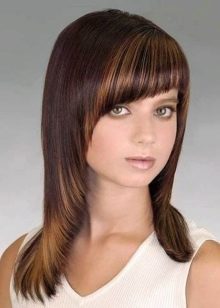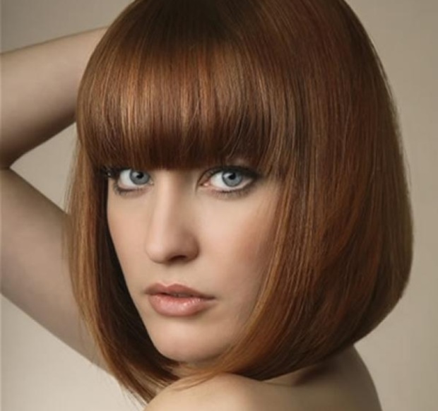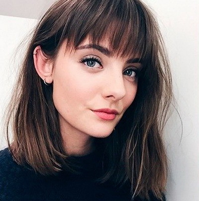 Straight, starting almost from the top of the crown itself and covering the eyebrows, it suits the owner of thick hair and high or wide forehead, gives it an image of tenderness and mystery, emphasizes the eyes. If you make a ragged edge, it is advantageously combined with an oval and round face.
