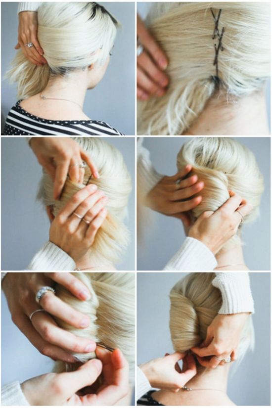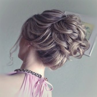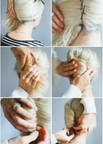 Clean hair needs to be curled with a curling iron to a state of large curls Collect them in gum, not stretching out to the end. Twist the elastic, and send the unused “length” over the beam and fix it permanently. Give your hair a graceful irregularity, send the ends back, hide and fix gently.
